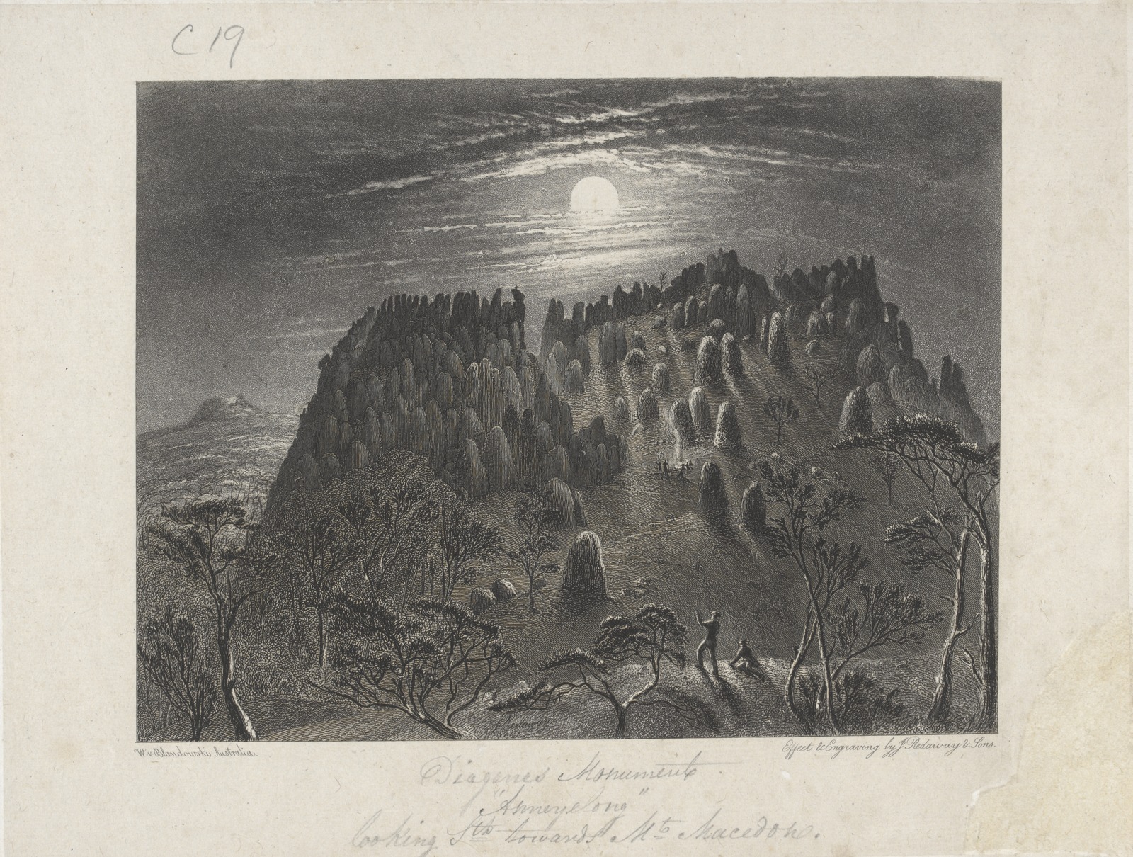 Diogenes Monument “Anneyelong” looking Sth towards Mt Macedon, by W. V. Blandowski, effect & engraving by J. Redaway & Sons (1855-1856), State Library Victoria.